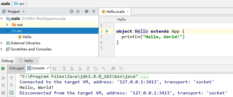 在工程 src 目录上右击 New => Scala class 创建 Hello.scala。输入代码如下,完成后点击运行按钮,成功运行则代表搭建成功。