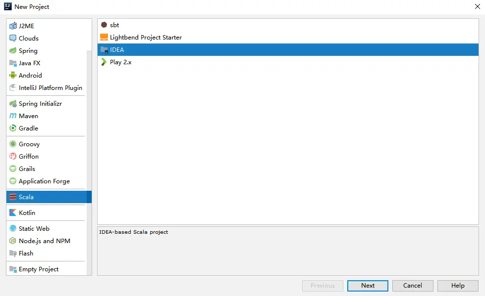 在 IDEA 中依次点击 File => New => Project 选项卡,然后选择创建 Scala—IDEA 工程: