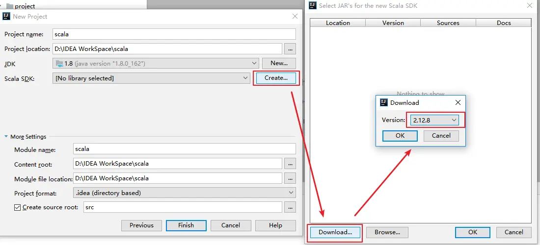 此时看到 Scala SDK 为空,依次点击 Create => Download ,选择所需的版本后,点击 OK 按钮进行下载,下载完成点击 Finish 进入工程。