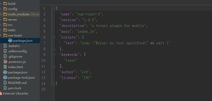 3. 填写包名、版本、git.地址、描述、入口文件、关键字、作者等或者选择不填,然后在vueToast文件夹下生成一个package.son文件,内容类似如下
