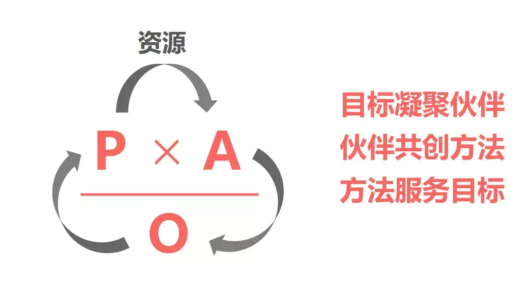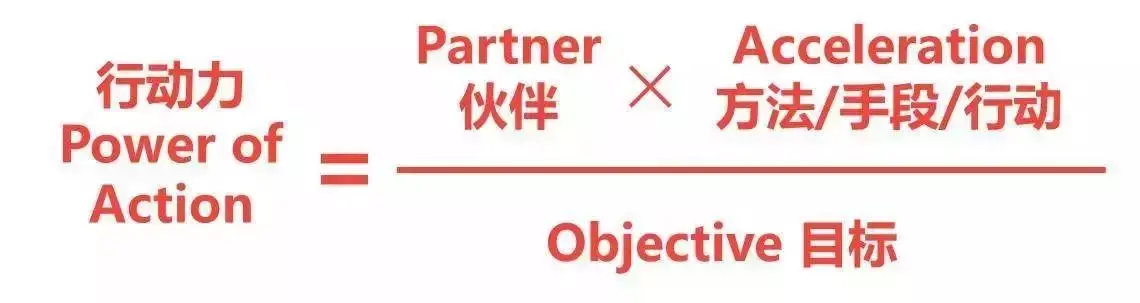 公式里的P指伙伴,O指目标,A指方法手段,POA指行动力,这个公式代表方法越有效,行动力就越强;伙伴越多,行动力就越快速;目标越小越聚焦,行动力就越强。