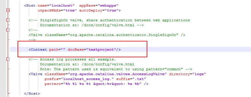 在两台tomcat的server.xml文件,Host标签中添加:<Context path="" docBase="testproject"/>,path标识访问路径,docBase为项目名,表示访问项目