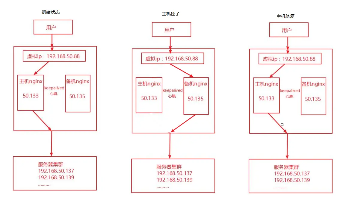 正常情况下,主nginx作为反向代理服务器即可,假设nginx服务器挂了的话,能够立即切换到备份机上,保证用户可以访问,然后运维人员把主nginx服务器故障修好之后,又能够自动切换到主nginx提供服务。通过keepalived来监测两台服务器,正常情况时,将nginx主服务器ip(192.168.50.133)绑定到keepalived定义的一个虚拟ip(我设置为192.168.50.88)上,通过这个虚拟IP可以访问nginx,然后备机(192.168.50.135)啥事不干,就是每隔一小段时间(设置为1秒)keepalived会告诉备机,你不用管,我还活着呢,如果突然主机死了,那么就会超过一秒备机没有收到主机或者的消息,那么备机马上接管主机,keeplived将虚拟ip绑定到备机身上,网站继续提供服务。