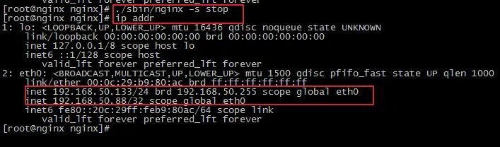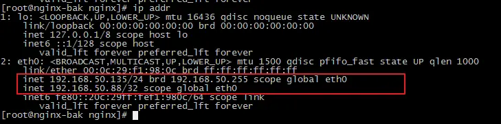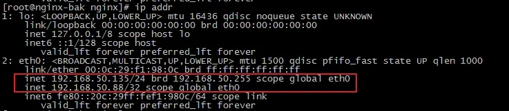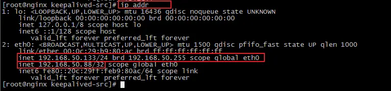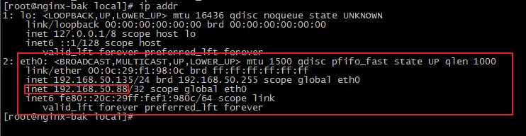 这时,nginx主机在提供服务,备机是闲着的,虚拟ip是192.168.50.88,在主机和备机上使用命令