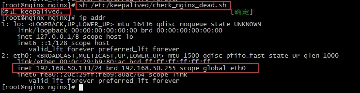 主机脚本检测nginx不在了,把keepalived停掉,从输出可以看到确实停止了,主机虚拟没有绑定虚拟ip