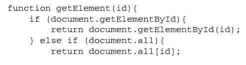 如果该函数存在(不是未定义),则使用 该函数。否则,就要继续检测 document.all 是否存在,如果是,则使用它。如果上述两个特性都不存在(很有可能),则创建并抛出错误,表示这个函数无法使用。