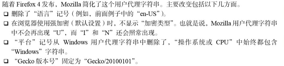 HTTP规范(包括 1.0和 1.1版)明确规定,浏览器应该发送简短的用户代理字符串,指明浏览器的 名称和版本号。