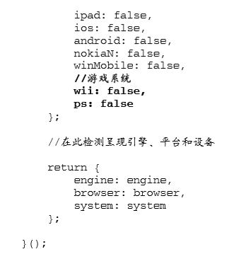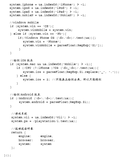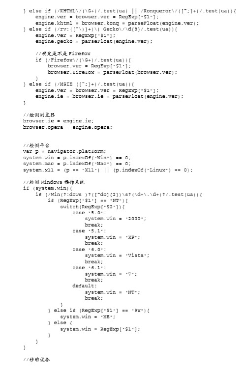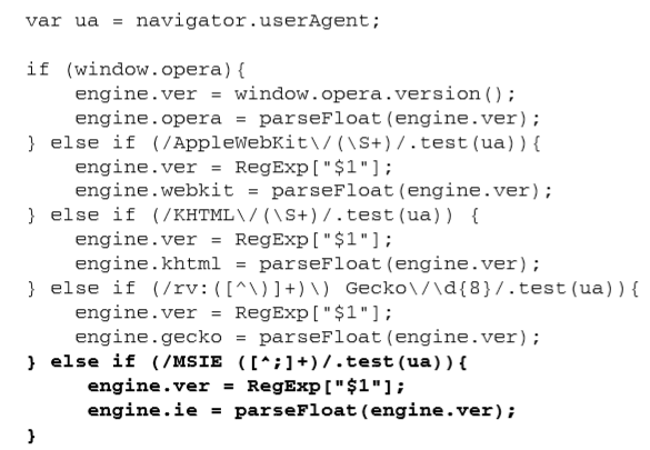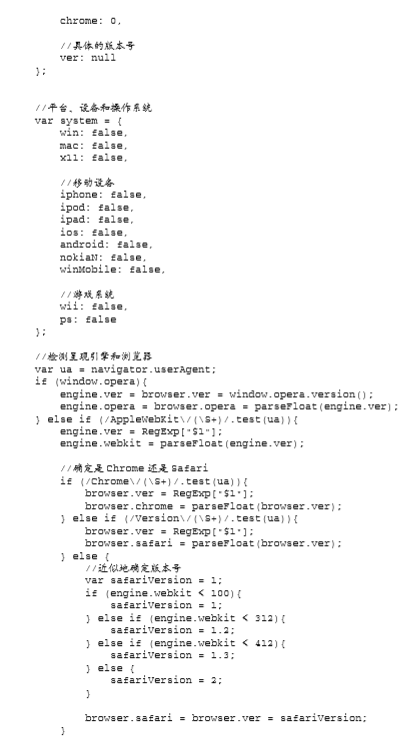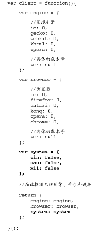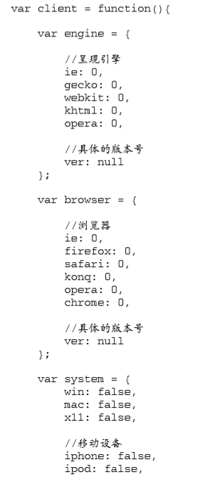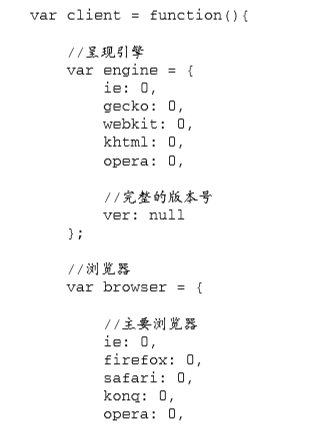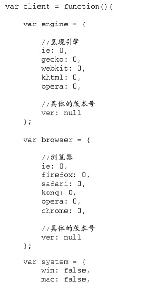 这里声明了一个名为 client 的全局变量,用于保存相关信息。匿名函数内部定义了一个局部变量 engine,它是一个包含默认设置的对象字面量。在这个对象字面量中,每个呈现引擎都对应着一个属 性,属性的值默认为 0。如果检测到了哪个呈现引擎,那么就以浮点数值形式将该引擎的版本号写入相 应的属性。而呈现引擎的完整版本(是一个字符串),则被写入 ver 属性