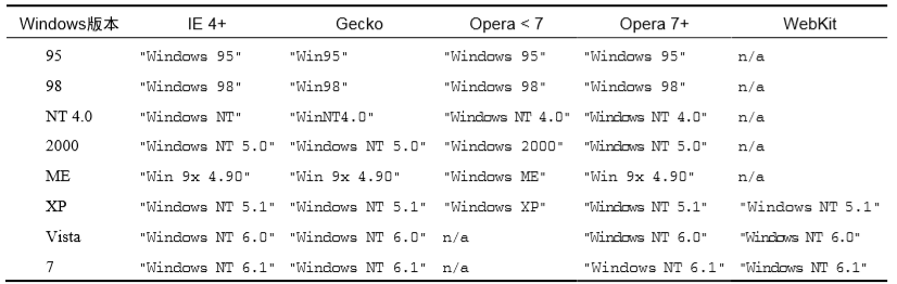 Gecko的早期版本在所有 Windows平台中都返回字符串"Windows",在所有 Mac平 台中则都返回字符串"Macintosh"。Firefox 1 确定了 navigator.platform 的值。