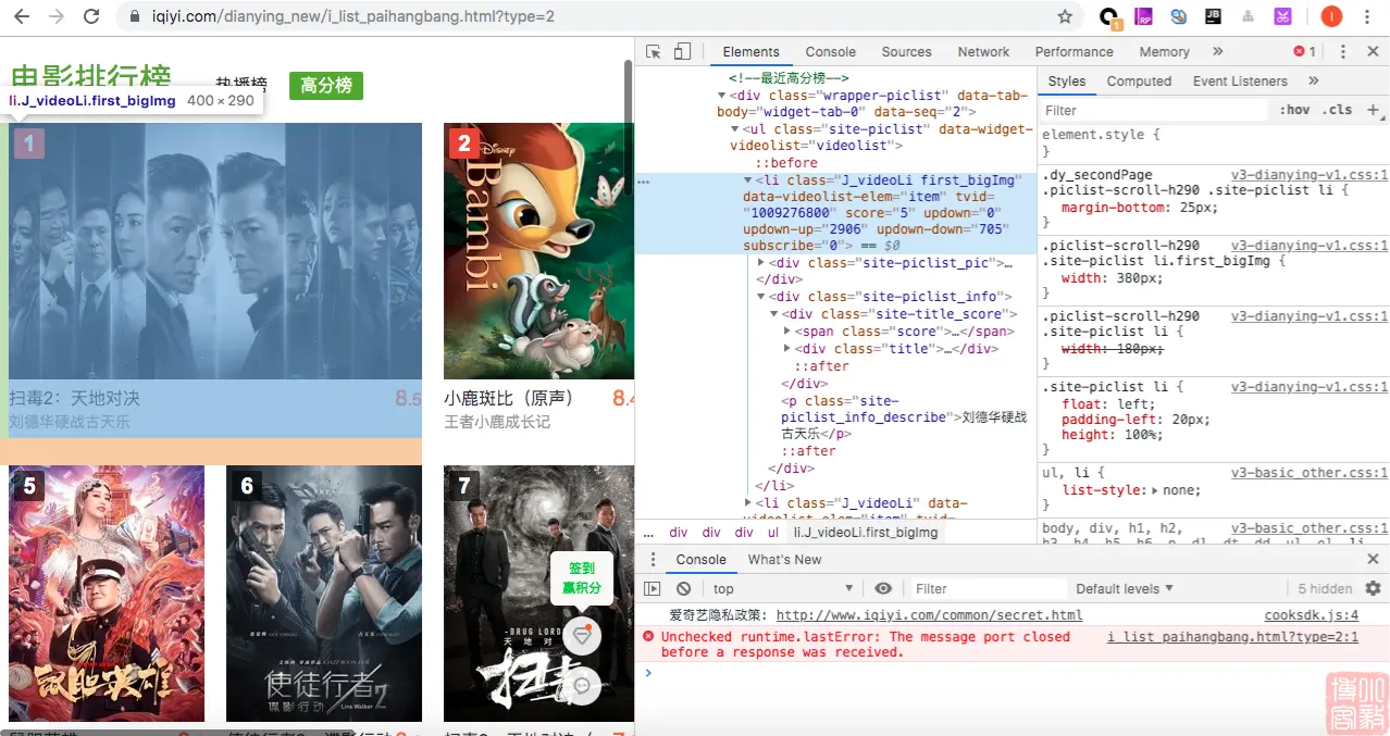 浏览器打开爱奇艺高分电影排行榜的地址 www.iqiyi.com/dianying_ne…,按 F12 审查元素。