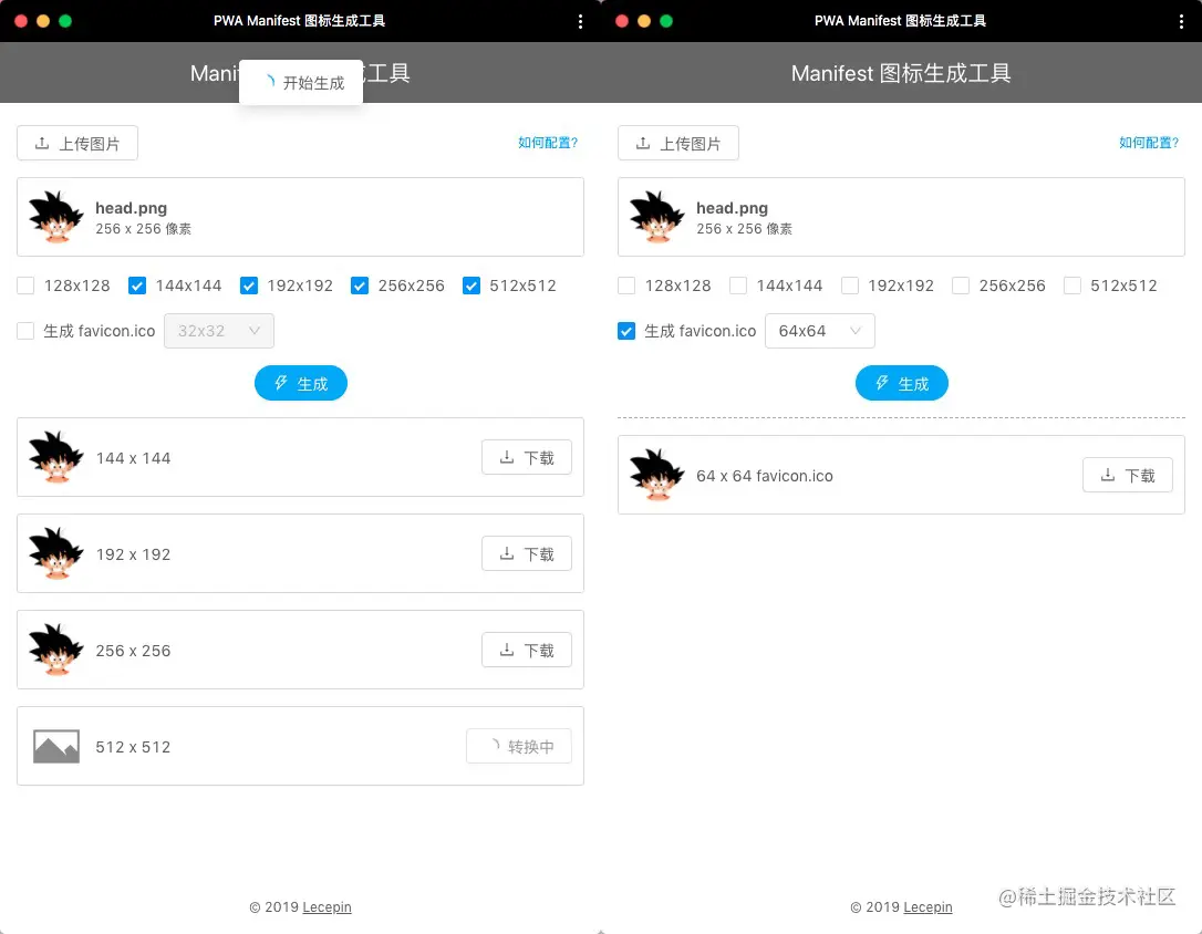 - 提供 PNG 图片,勾选要生成的尺寸,可以直接进行转换生成。