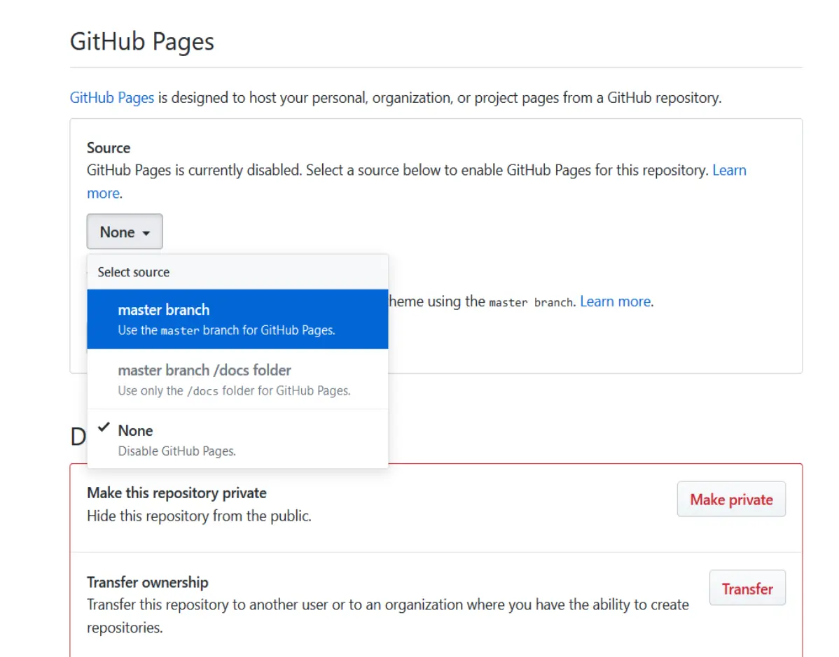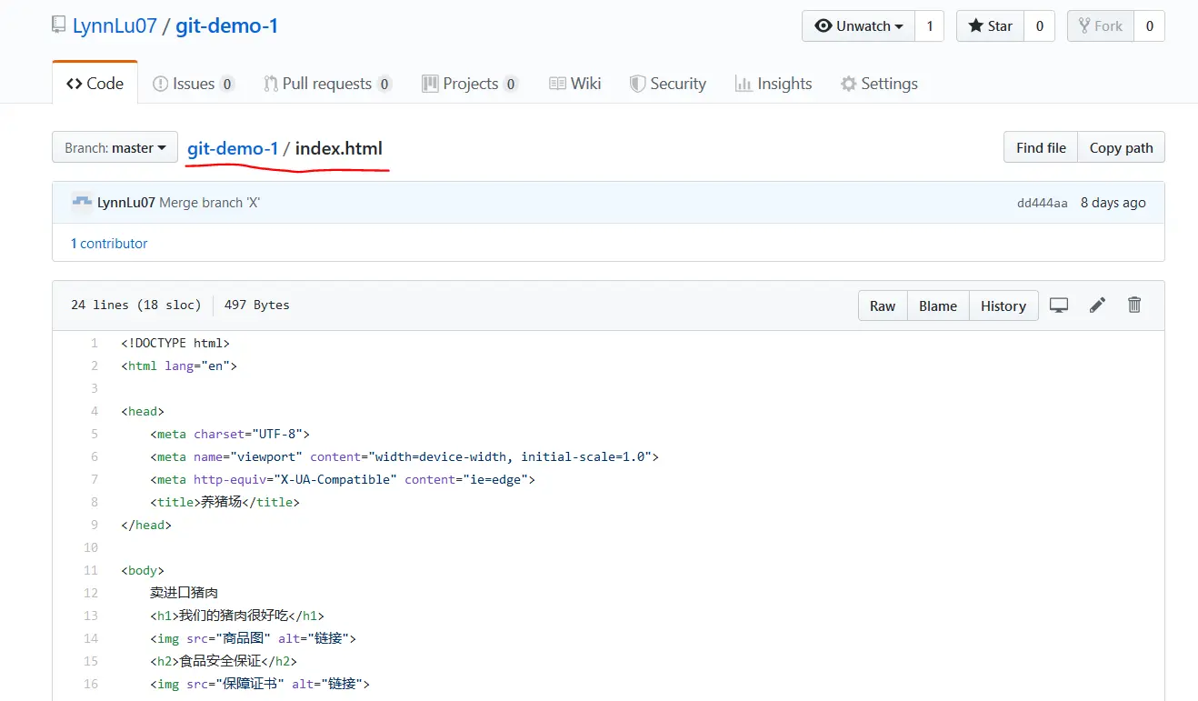 如何使用 GitHub Pages 预览 HTML GloriaLi 2019-09-22 228 阅读1分钟 进入repo,打开setting。 往下拉到GitHub Pages。 source一栏选择master branch。 得到这个repo的预览地址。 在预览地址后面加上想访问的html路径名称即可。 例如我的html路径名称为git-demo-1/index.html,则可以访问http://lynnlu.xyz/git-demo-1/index.html。