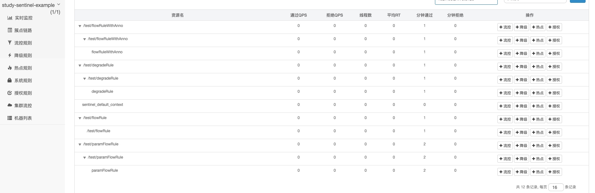 - 可以看到除了我们手动通过注解定义的资源名,还多了一些是通过我们的 controller 路径的资源名,这些都是我们客户端集成 spring-cloud-starter-alibaba-sentinel 包后,自动适配的。这两种其实在使用上有区别的