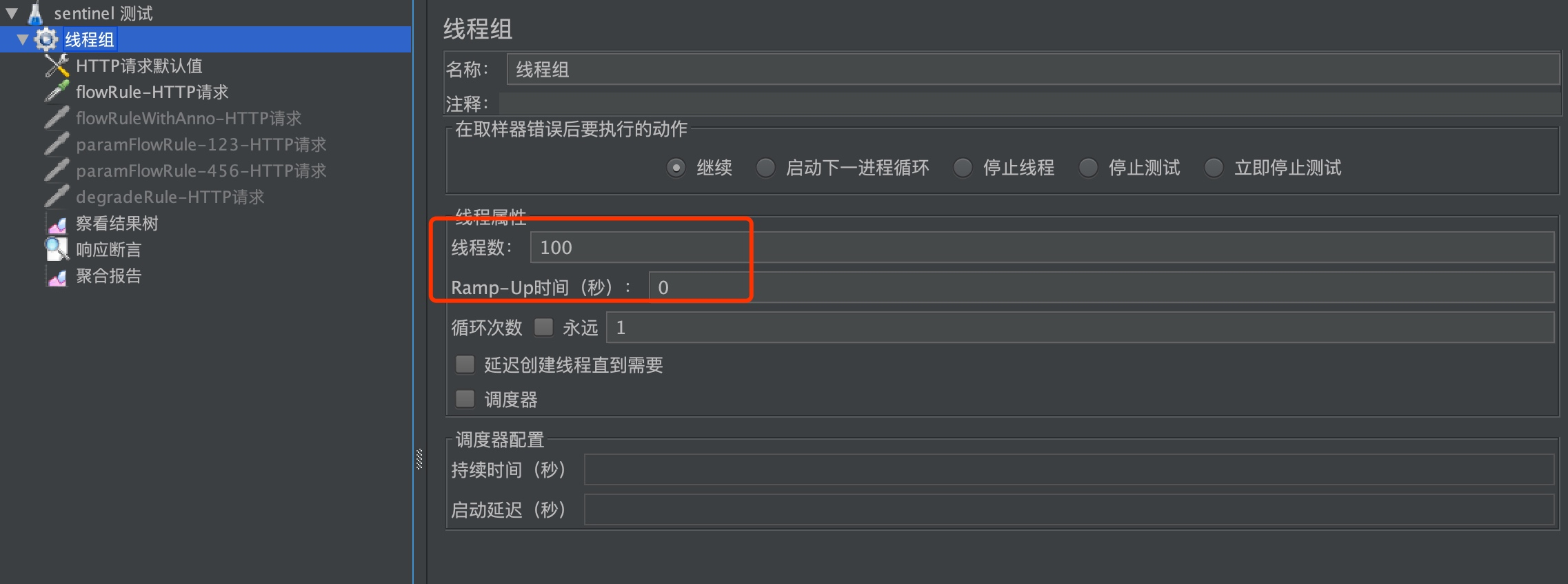线程组要把线程设置成 100,方便后面的统计,另外为了在一秒内执行完,Ramp-Up 时间设为0