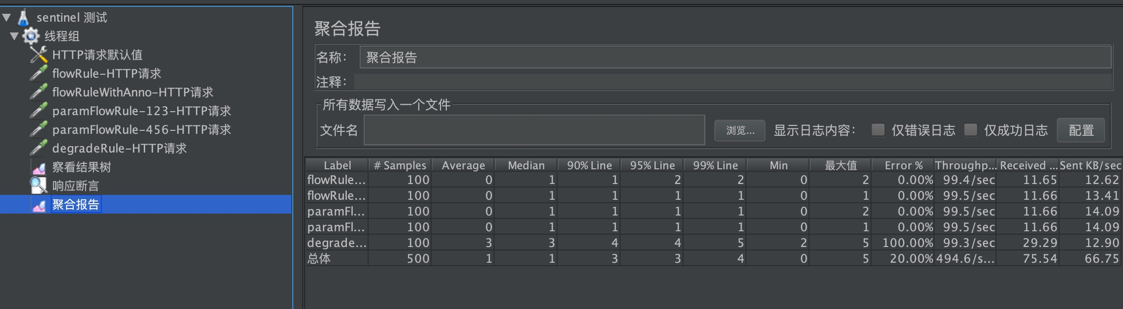 聚合统计,这个可以统计出100个线程请求后的总体结果,我们只要看 Error% 的失败率就可以了。图中可以看到除了熔断限流,其它限流失败率是 0