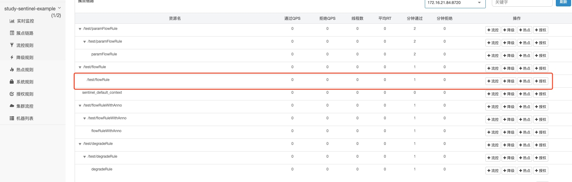- 在簇点链路中找到 /test/flowRule,并点击流控按钮