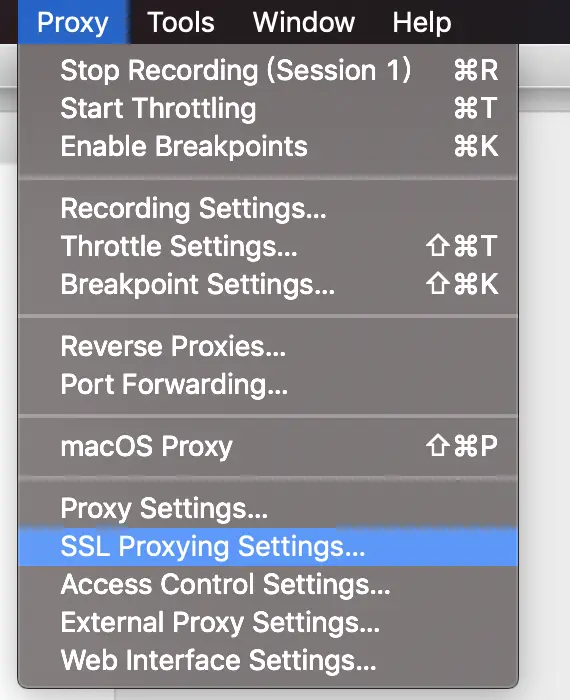 Proxy-> SSL Proxying Settings->SSL Proxying:勾选Enable SSL Proxying
