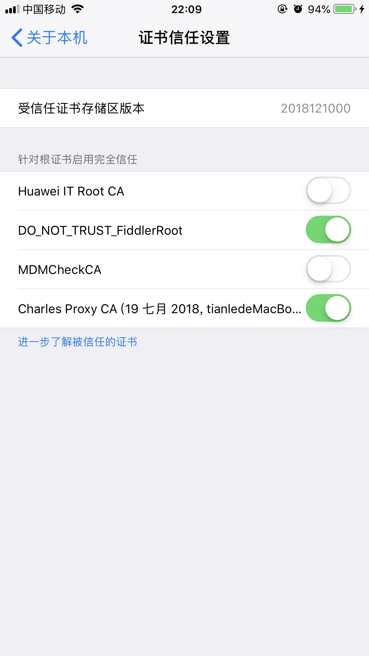 设置-> 通用 ->关于本机-> 证书信任设置 ->选择好证书