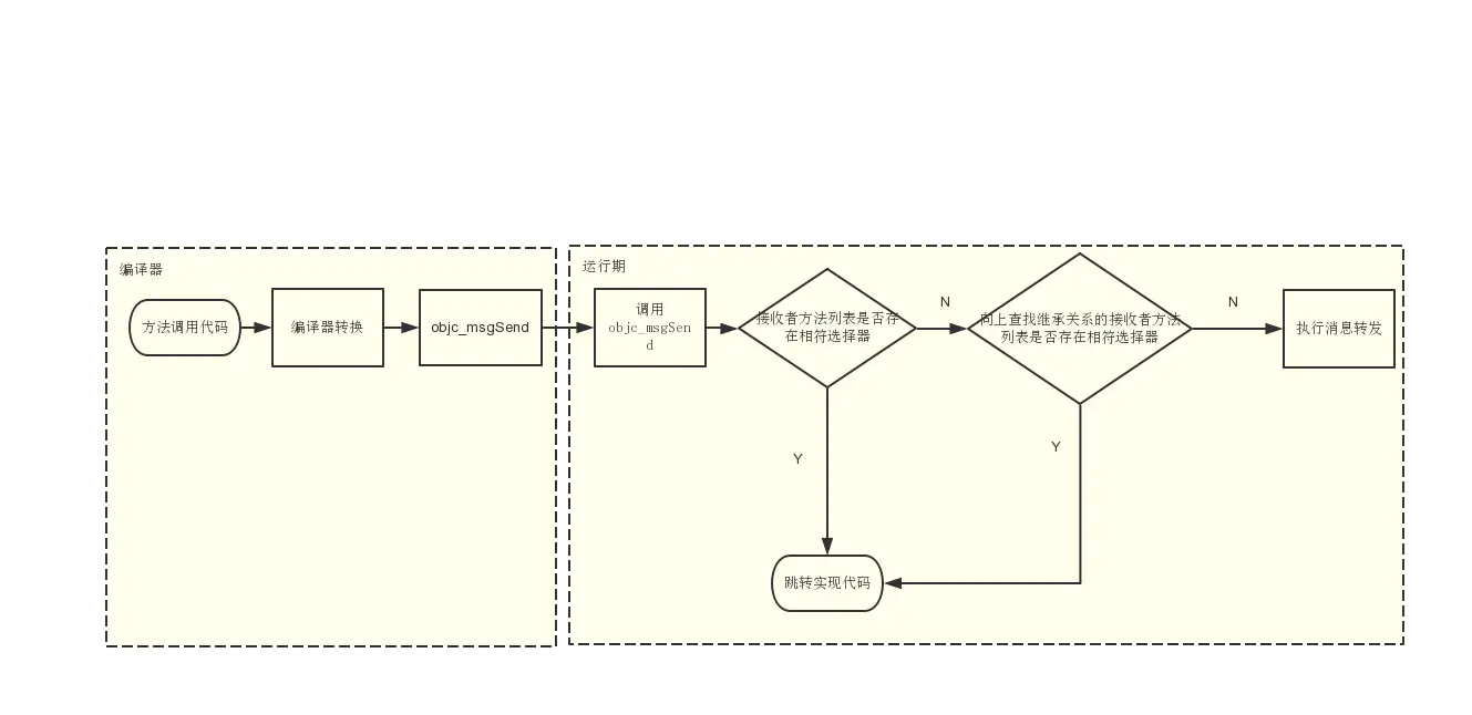 objc_msgSend函数会依据接受者和选择器的类型调用适当的方法。此时,objc_msgSend会在接收者所属的类中搜寻一个方法列表,如果能找到和选择器名称相符合的方法,就跳转到其实现的代码。如果找不到,就沿着继承体系继续向上查找,等找到合适的方法后再跳转。如果这时候还是找不到符合的方法,就执行消息转发(message forwarding)操作,这个会在下一篇文章中详解。下面用一个流程图说明上述过程: