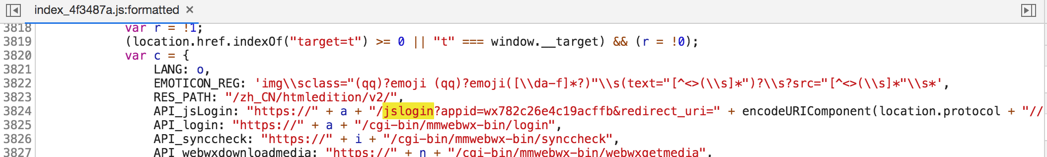 通过搜索关键字 jslogin 我们发现了些有趣的内容,在这一段位置包含了后续所有请求所需的路径。包括当前关联的 API_jsLogin