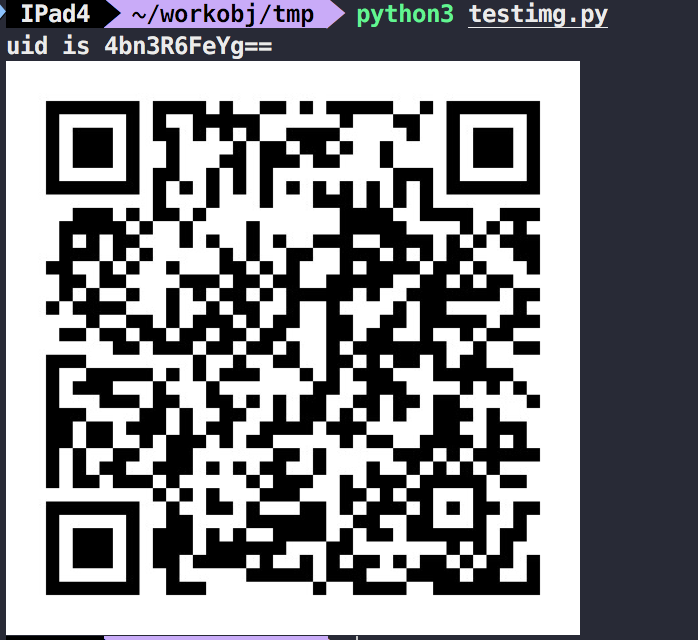 这边我们使用 imgcat来直接在命令行中显示图片,注意,此模块只适用于mac。我们将如上代码写入名为testimg.py中并运行得到如下结果。可见二维码已经被成功打印。