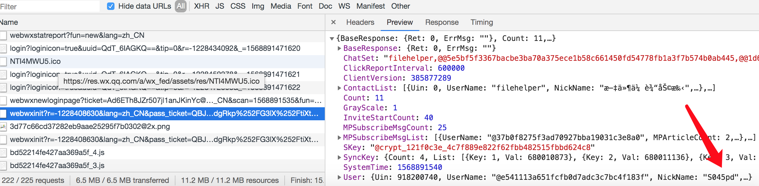 接下来我们看到下一个请求的响应体中,已经包含了我的昵称S045pd。也就是说此刻我们已成功登录,并且该请求获取了当前个人的信息。