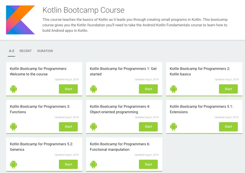 该在线教程是谷歌与 Udacity (一家在线教育机构,教学语言为英语)合作共同推出,为帮助 Kotlin 的学习者,提供基于视频的课程,以及如何在 Kotlin 构建 Android 应用程序,这两门课程分别是: