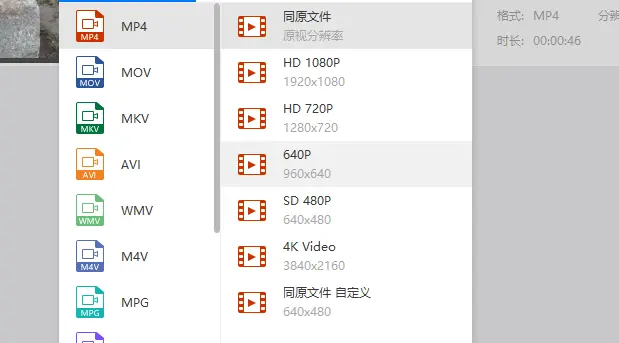 2、然后就需要选择一个输出文件的格式了。也就是在软件左下角的输出格式中选择转换后视频的格式为mp4格式,然后再选择视频的分辨率为原视频分辨率。