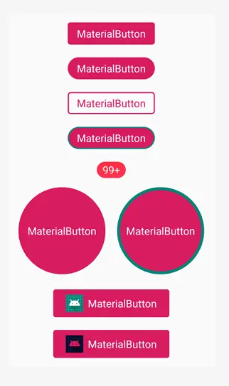 MaterialButton在design包,继承AppCompatButton,在原来Button的基础上做了一些扩展,如圆角、描边、前置icon(icon支持设置Size,Tint,Padding)等,还支持按压水波纹并且设置color,基本能满足日常的需求。