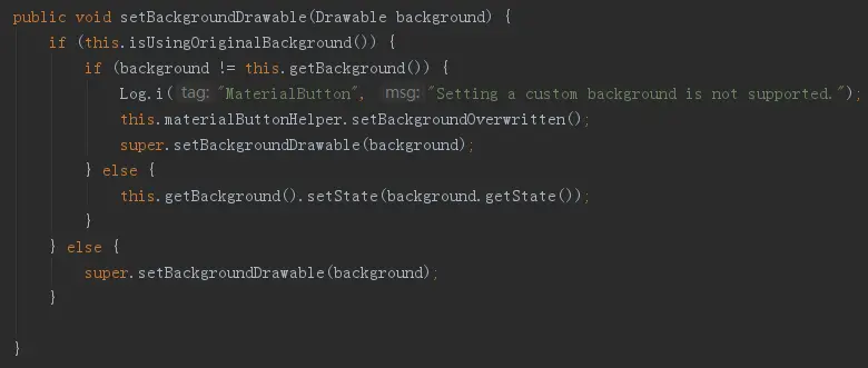 大致意思是,可以使用app:backgroundTint和app:backgroundTintMode指定背景色,该属性接收color。 Button的background可以设置shape、select的drawable,但是MaterialButton只能设置color drawable。源码里有这么一段: