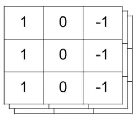下图动画演示了此种卷积操作。为了方便起见,只在红色通道内寻找垂直边缘。所以绿色和蓝色通道权值都为0。但要记住这些通道上相乘得到的结果要添加到红色通道结果中。