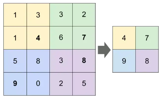 池化将输入值聚到一起,从而进一步减小大小。因为估测的参数数量减少了,计算时间就会加快。除此之外,通过加固网络会帮助避免过度拟合。下面会用大小为2×2跨度为2来阐述最大池化。