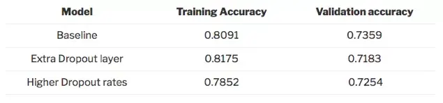 我们着眼于前两个操作,检测了结果。第一个模型的结果会作为基线。额外应用随机失活函数层并提升随机失活率后,模型的过度拟合状况有所好转。