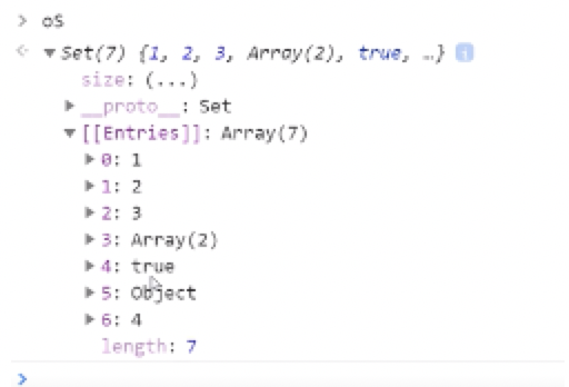 let os = new Set([1,2,3,[1,2],true,{a:1,b:2}]);