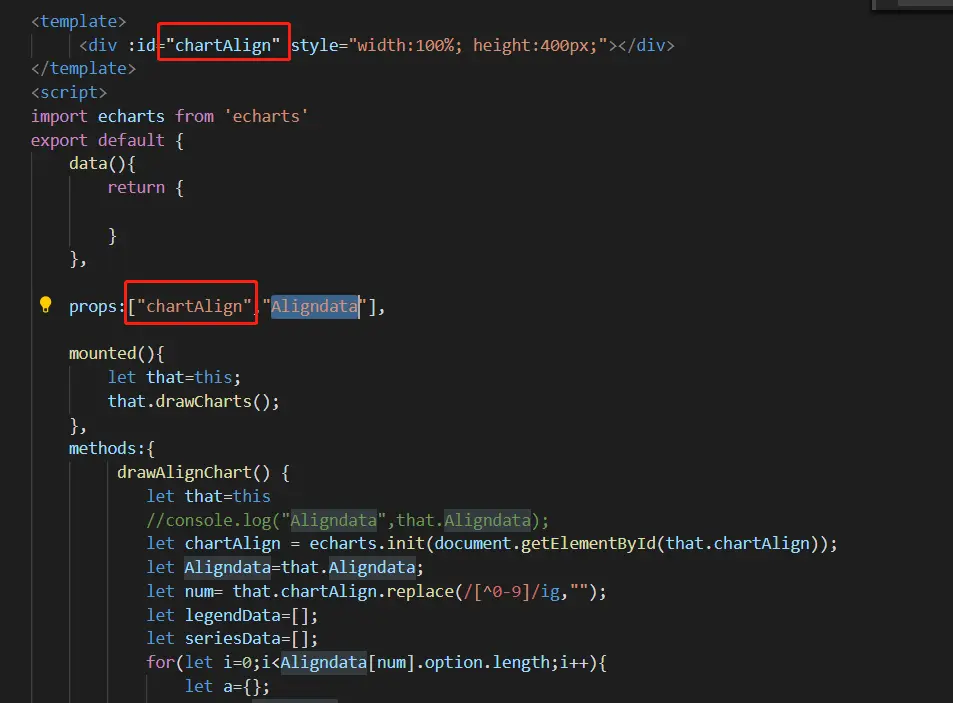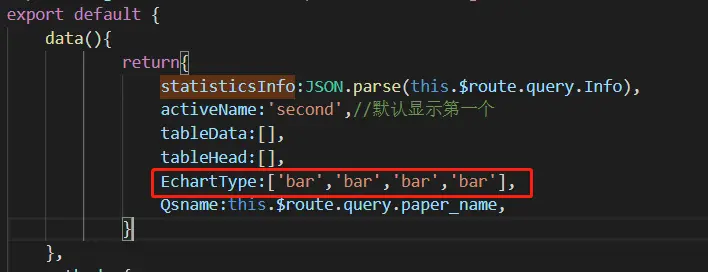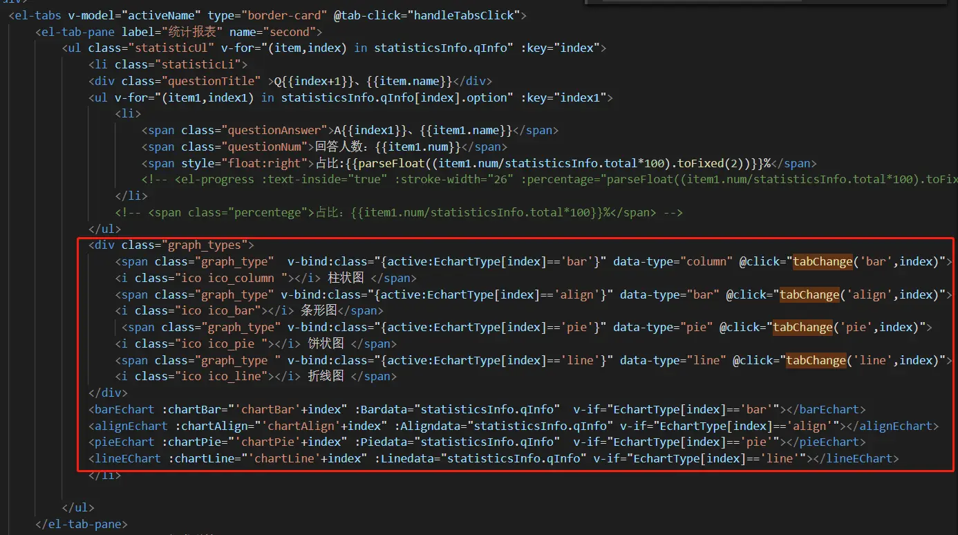 仿腾讯问卷-echart多个图表的切换 弦鱼 2019-09-23 870 阅读1分钟 腾讯问卷实现如下:我实现如下:功能描述:把每个问题的占比用四种图形表示出来难点:实现让每个数据互不影响的切换解决过程:1.先给每种图表单独写一个子组件。2.子组件中,chartAlign代表每个图表的id,Aligndata代表每个图表的数据。3.在父页面引入4.父页面使用组件其中的EchartType默认数据是['bar','bar','bar','bar'],所以开始展示的都是柱状图click函数如下