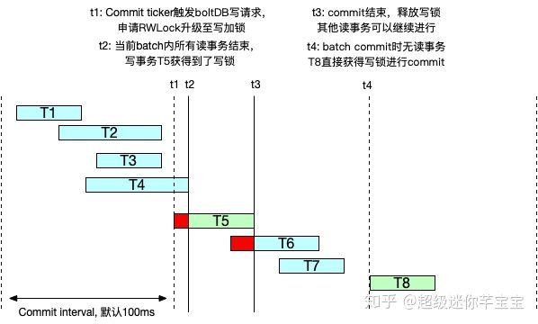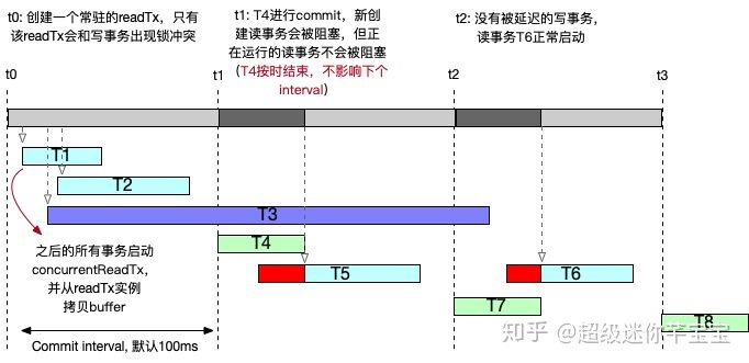 如下图(以下图中,蓝色条为读事务,绿色条为写事务,红色条为事务因锁问题阻塞),t1 时间点会触发 commit,然而有事务未结束,T5 commit 事务因申请锁被阻塞到 t2 时间点才进行。理想状态下大量的写事务会在一个 batch 中结束,这样每次 commit 的写事务仅仅阻塞少部分的读事务(如图中仅仅阻塞了 T6 这个事务)。