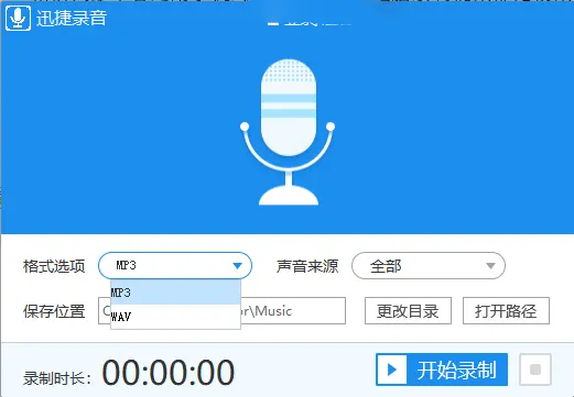 1、打开电脑上安装的迅捷录音软件,打开之后对录音的格式进行选择,我选择的是MP3格式。