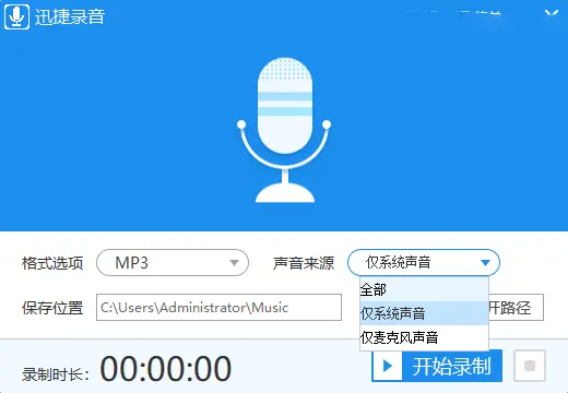 2、选择想要录制的声音来源有“全部”、“仅系统声音”和“仅麦克风声音”三种选择,我选择仅系统声音(只录制电脑发出的声音)。