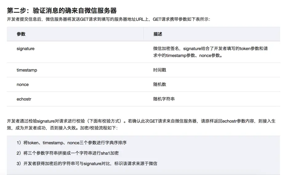 开发者通过检验signature对请求进行校验(下面有校验方式)。若确认此次GET请求来自微信服务器,请原样返回echostr参数内容,则接入生效,成为开发者成功,否则接入失败。加密/校验流程如下: 1)将token、timestamp、nonce三个参数进行字典序排序 2)将三个参数字符串拼接成一个字符串进行sha1加密 3)开发者获得加密后的字符串可与signature对比,标识该请求来源于微信