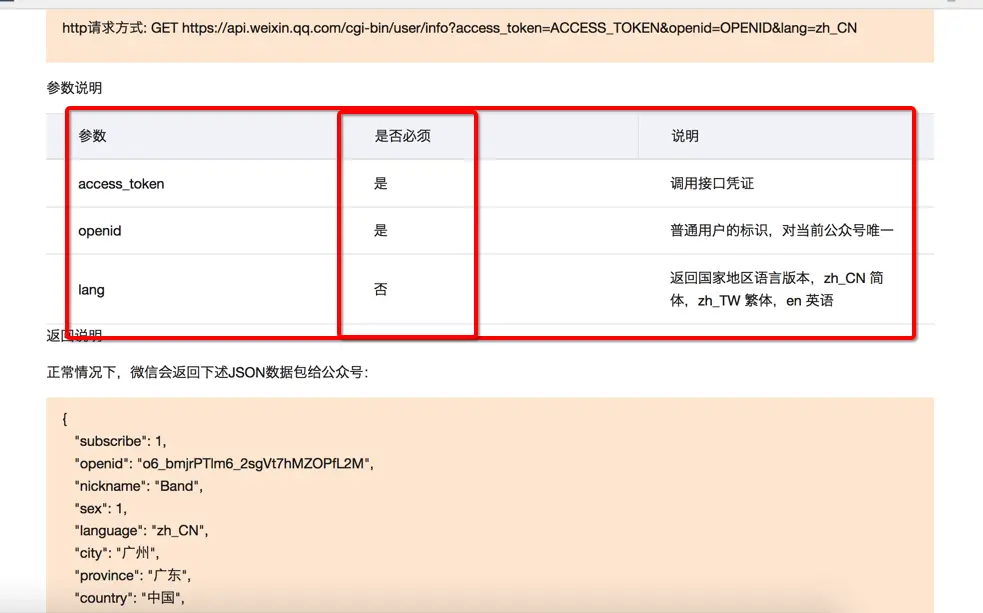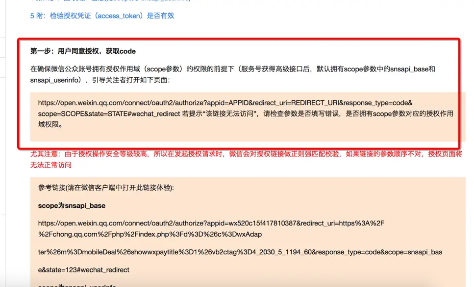 1、以snsapi_base为scope发起的网页授权,是用来获取进入页面的用户的openid的,并且是静默授权并自动跳转到回调页的。用户感知的就是直接进入了回调页(往往是业务页面) 2、以snsapi_userinfo为scope发起的网页授权,是用来获取用户的基本信息的。但这种授权需要用户手动同意,并且由于用户同意过,所以无须关注,就可在授权后获取该用户的基本信息。 3、用户管理类接口中的“获取用户基本信息接口”,是在用户和公众号产生消息交互或关注后事件推送后,才能根据用户OpenID来获取用户基本信息。这个接口,包括其他微信接口,都是需要该用户(即openid)关注了公众号后,才能调用成功的。 ######关于网页授权access_token和普通access_token的区别 1、微信网页授权是通过OAuth2.0机制实现的,在用户授权给公众号后,公众号可以获取到一个网页授权特有的接口调用凭证(网页授权access_token),通过网页授权access_token可以进行授权后接口调用,如获取用户基本信息; 2、其他微信接口,需要通过基础支持中的“获取access_token”接口来获取到的普通access_token调用。 ######关于UnionID机制 1、请注意,网页授权获取用户基本信息也遵循UnionID机制。即如果开发者有在多个公众号,或在公众号、移动应用之间统一用户帐号的需求,需要前往微信开放平台(open.weixin.qq.com)绑定公众号后,才可利用UnionID机制来满足上述需求。 2、UnionID机制的作用说明:如果开发者拥有多个移动应用、网站应用和公众帐号,可通过获取用户基本信息中的unionid来区分用户的唯一性,因为同一用户,对同一个微信开放平台下的不同应用(移动应用、网站应用和公众帐号),unionid是相同的。