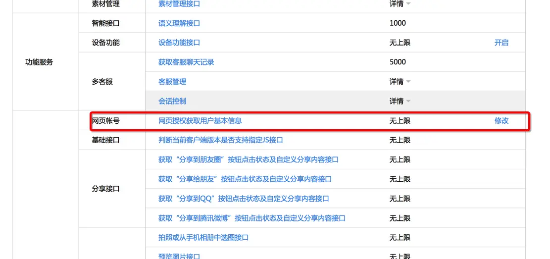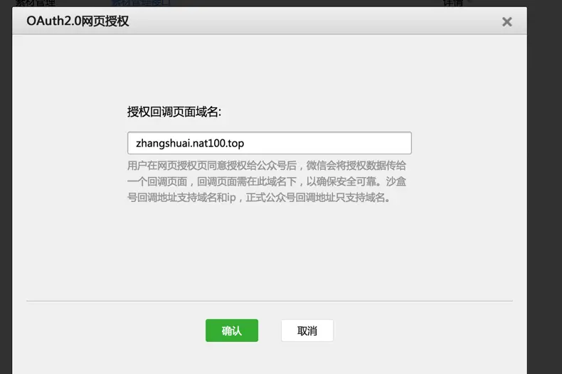 1、在微信公众号请求用户网页授权之前,开发者需要先到公众平台官网中的“开发 - 接口权限 - 网页服务 - 网页帐号 - 网页授权获取用户基本信息”的配置选项中,修改授权回调域名。请注意,这里填写的是域名(是一个字符串),而不是URL,因此请勿加 http:// 等协议头; 2、授权回调域名配置规范为全域名,比如需要网页授权的域名为:www.qq.com,配置以后此域名下面的页面http://www.qq.com/music.html 、 www.qq.com/login.html 都可以进行OAuth2.0鉴权。但http://pay.qq.com 、 music.qq.com 、 qq.com无法进行OAuth2.0鉴权 3、如果公众号登录授权给了第三方开发者来进行管理,则不必做任何设置,由第三方代替公众号实现网页授权即可