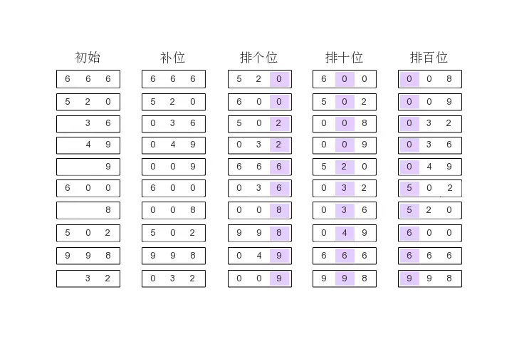 上图演示了基数排序算法的总体流程。先按个位从小到大排序,然后再按十位、百位排序。只要排序算法是稳定的,那么最后整体就是有序的。为了方便看出数字的每一位具体是多少,这里对位数少的数字进行了左边补0。