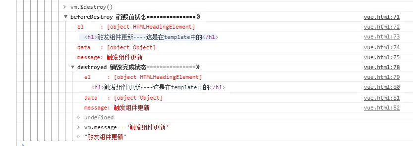 实例销毁后,Vue 实例的所有东西都会解除绑定,所有的事件监听器会被移除,所有的子实例也会被销毁,dom 和属性方法虽然都还存在,但改变他们将不再生效!