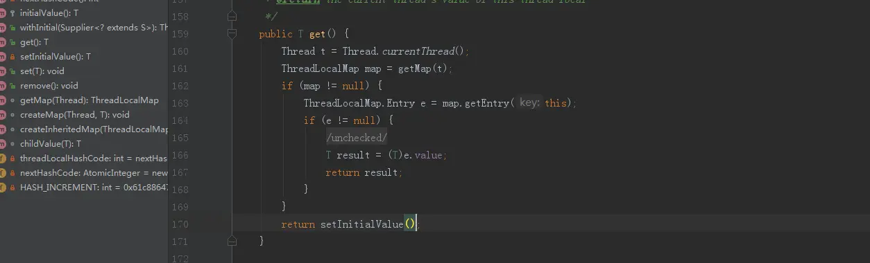 先获取当前线程ThreadCurrent.currentThread();获取当前线程的ThreadLocal.ThreadLocalMap 变量,若为空,返回空值,若不为空,根据当前的TheadLocal实例获取对应的value值