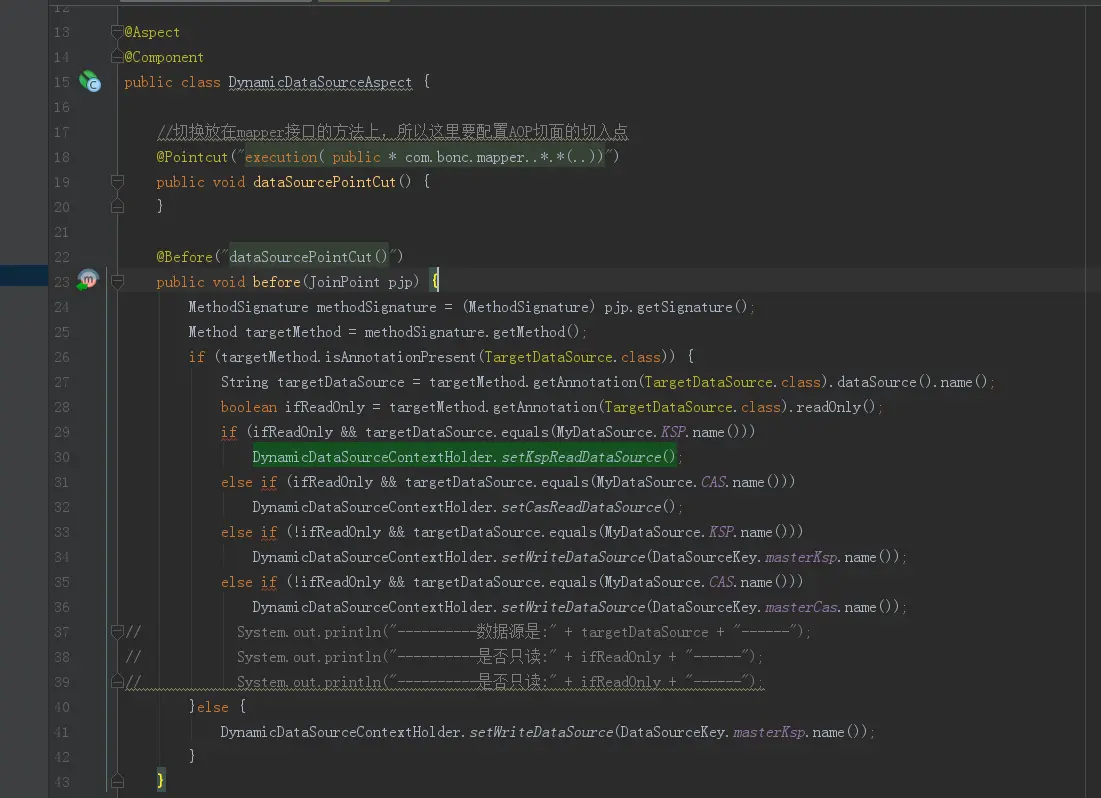 在mybatis接口方法上添加自定义注解,通过切面在执行前获取切面上的参数(动态数据源的key),ThreadLocal将获取的key写入本地线程变量,DynamicRoutingDataSource在获取连接时从ThreadLocal读取当前查询指定的数据源。
