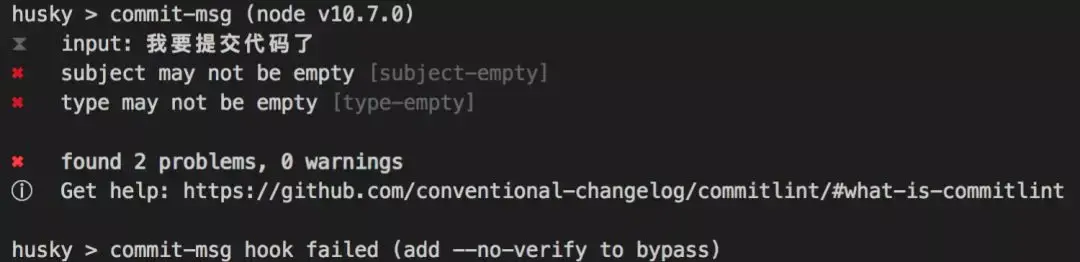 这样在输入不符合风格的commit Message会无法通过,并会给出具体的提示。