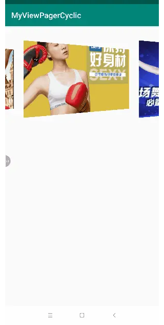 关于普通的ViewPager无限轮播很多博客都有实现,我就不赘述了,也有很多优秀的开源库,很好用比如说Banner,那我们为什么不自己实现一下另类的轮播呢。先看图: