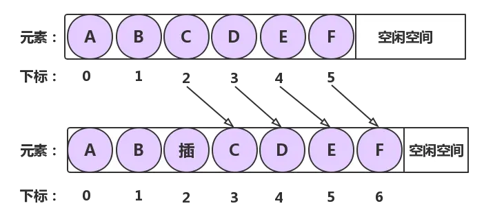那么最坏的情况又是这样的,元素正好插入到第一个位置上,这就意味着后面的所有元素全部需要移动一个位置,所以时间复杂度为 O(n)
