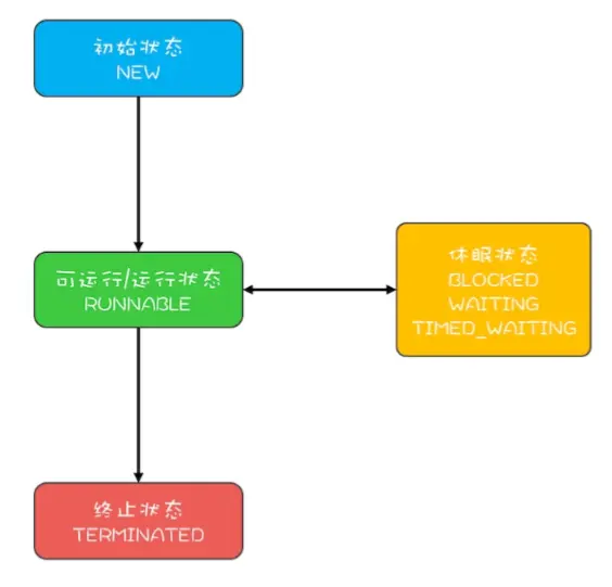 BLOCKED,WAITING,TIMED_WAITING 是上面提到的休眠状态。Java线程处于这些状态那么这个线程就永远没有CPU的使用权。
