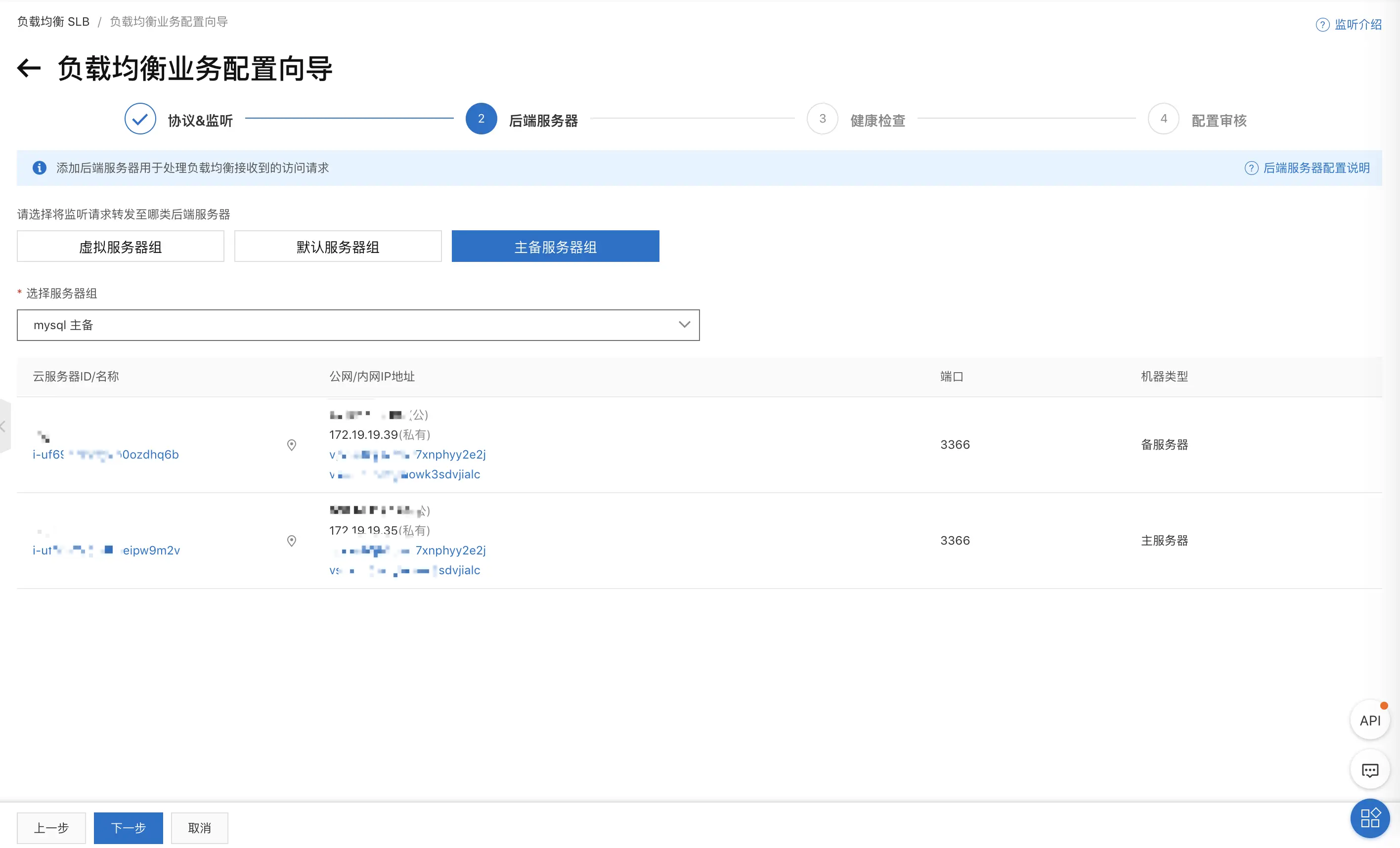 SLB 配置监听端口 3306,后端协议为 TCP,后端服务器类型为 主备服务器组,然后添加一个信息主备服务器组,然后主服务器为 172.19.19.35 端口 3366,备用服务器 172.19.19.39 端口 3366,选中下一步添加成功